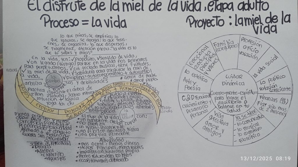 Para interpretar el proceso «la vida» , tener presente que lo amarillo es la lineal de la vida que es deformada por fuerzas opuestas (Yin Yang) desde que nacemos hasta que trascendemos; para interpretar el proyecto: «la miel de la vida», tener presente que se hace circular porque debemos trabajarle a todas las dimensiones humanas; como siempre, se le trabaja primero a lo que tengamos descuidado.
