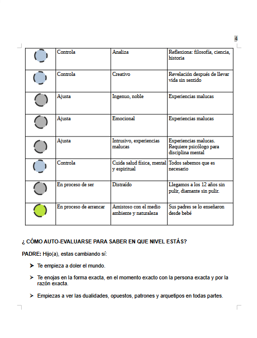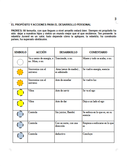 PADRES: Mi ternurita, con que llegues a nivel amarillo estará bien. Siempre mi propósito ha sido: dejar a nuestros hijos y nietos un mundo mejor que el que recibimos. Ten presente: la rebeldía Juvenil es un valor, todo depende cómo la apliques; la rebeldía, ha construido países, ha superado obstáculos. Ver imágenes abajo, en las fotos numeradas, página 3 para ver la tabla con los símbolos, es importante para poder ver los colores que representan cada nivel.