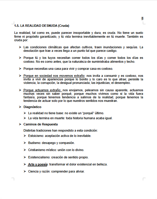 La realidad, tal como es, puede parecer insoportable y dura, es cruda. No tiene un suelo firme ni propósito garantizado, y tú vida termina inevitablemente en tú muerte. También es cruda por: